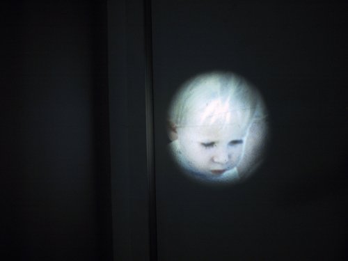 “Memory Hole” (2003) Installation : projector, pierced white Plexiglas screen (50 x 50cm) In this simple mechanism, a photographic image of myself, taken at a time from before I can remember, is projected on a pierced screen. The projection is focussed on the wall behind so that the image on the screen has an indistinct, dreamlike quality. At the same time, the image of my head projected through the aperture in the screen is in focus. The shiny, plastic screen provides a third, more readable image in the form of a reflection in which the baby’s face is missing. According to Freud, it is possible that we do not have any “real” memories of early childhood as such, but associations that emerge at later periods in relation to subsequent events. These memories are analogous to dreams or fictions constructed out of psychic conflicts and combining elements from different sources. Consequently, memory could be considered as a montage of real and false elements. |